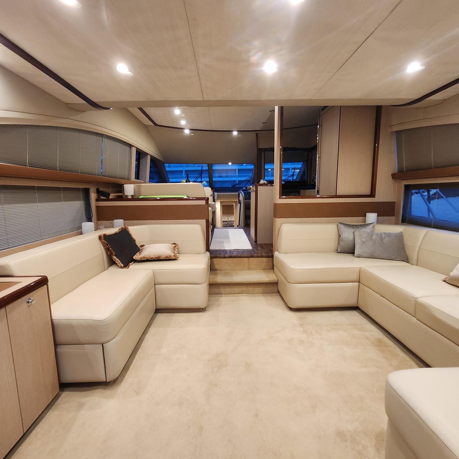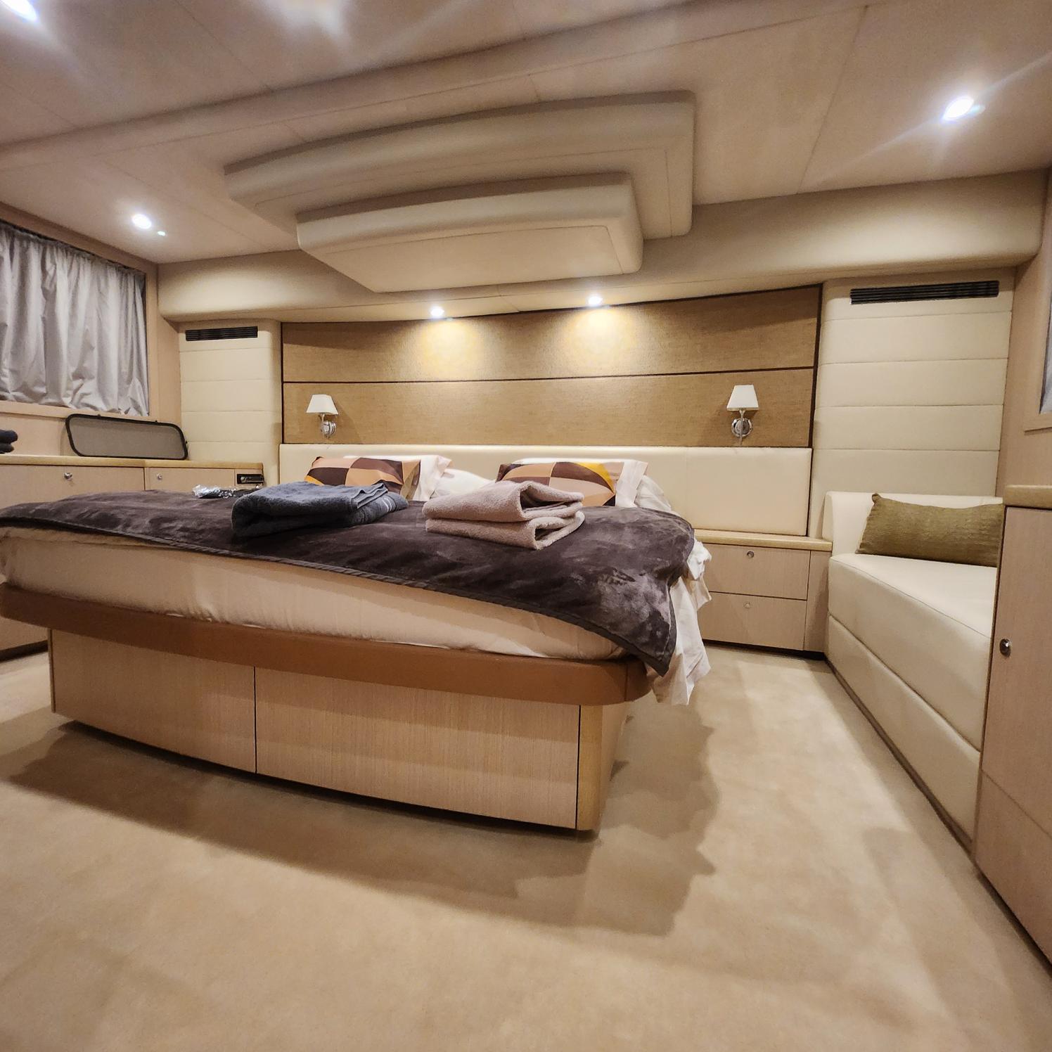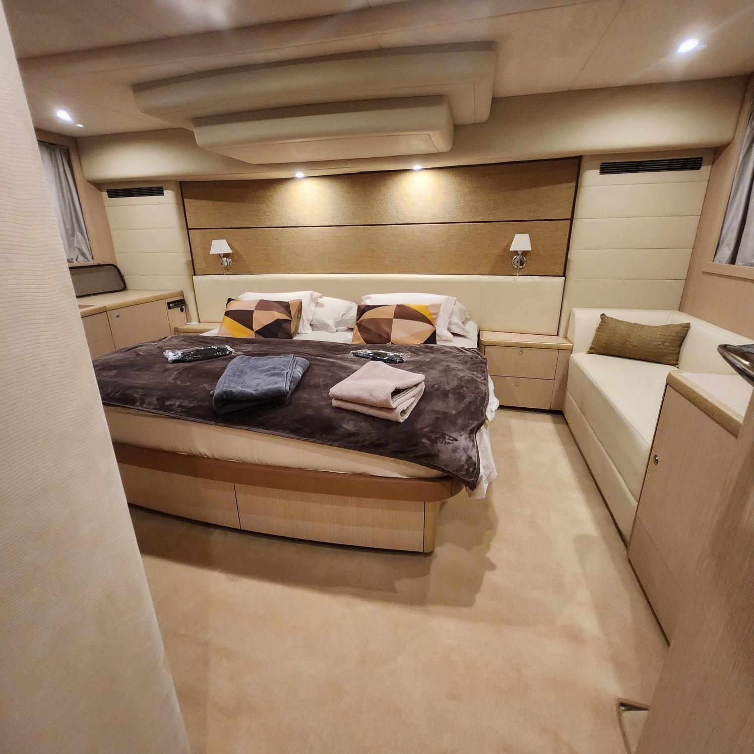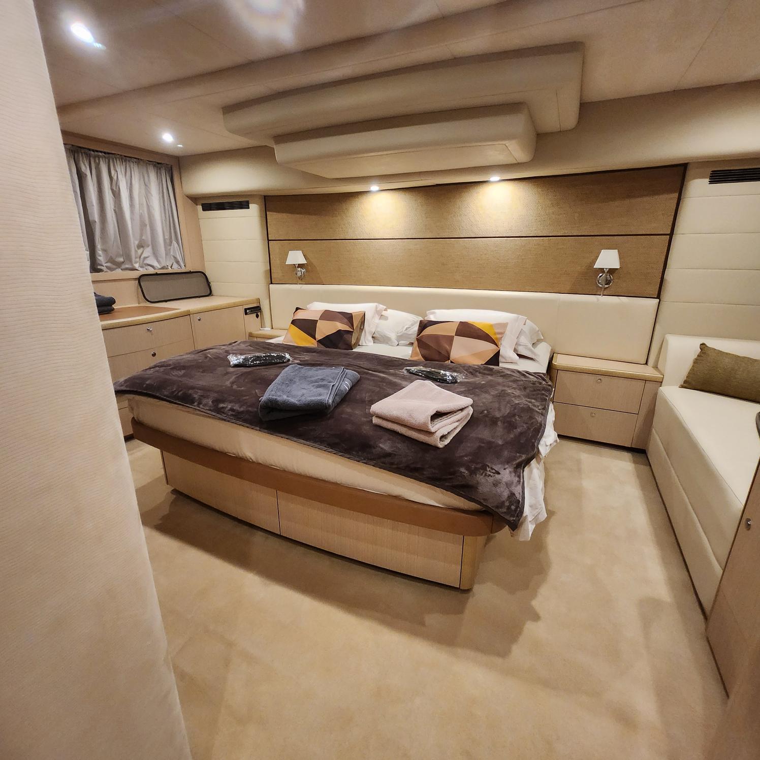 Princess 62 „Sassy“ was first launched in 2009 as a luxury stylish model of Princess Shipyard. Since then, this maritime gem has been an epitome of opulence and nautical skills. With a recent refit, Sassy not only maintains her regal allure but also embraces modernity in style and functionality. Moreover, Sassy’s allure is immediately evident as you step into her contemporary and neutral-toned interior. The spacious salon, with panoramic windows, invites abundant natural light, creating an open and airy ambiance. In addition, the aft lounge area boasts two generous sofas, a coffee table, and a state-of-the-art drop-down entertainment system. Forward, a spacious dining table, offers not only a meal but a feast for the eyes through the surrounding windows.