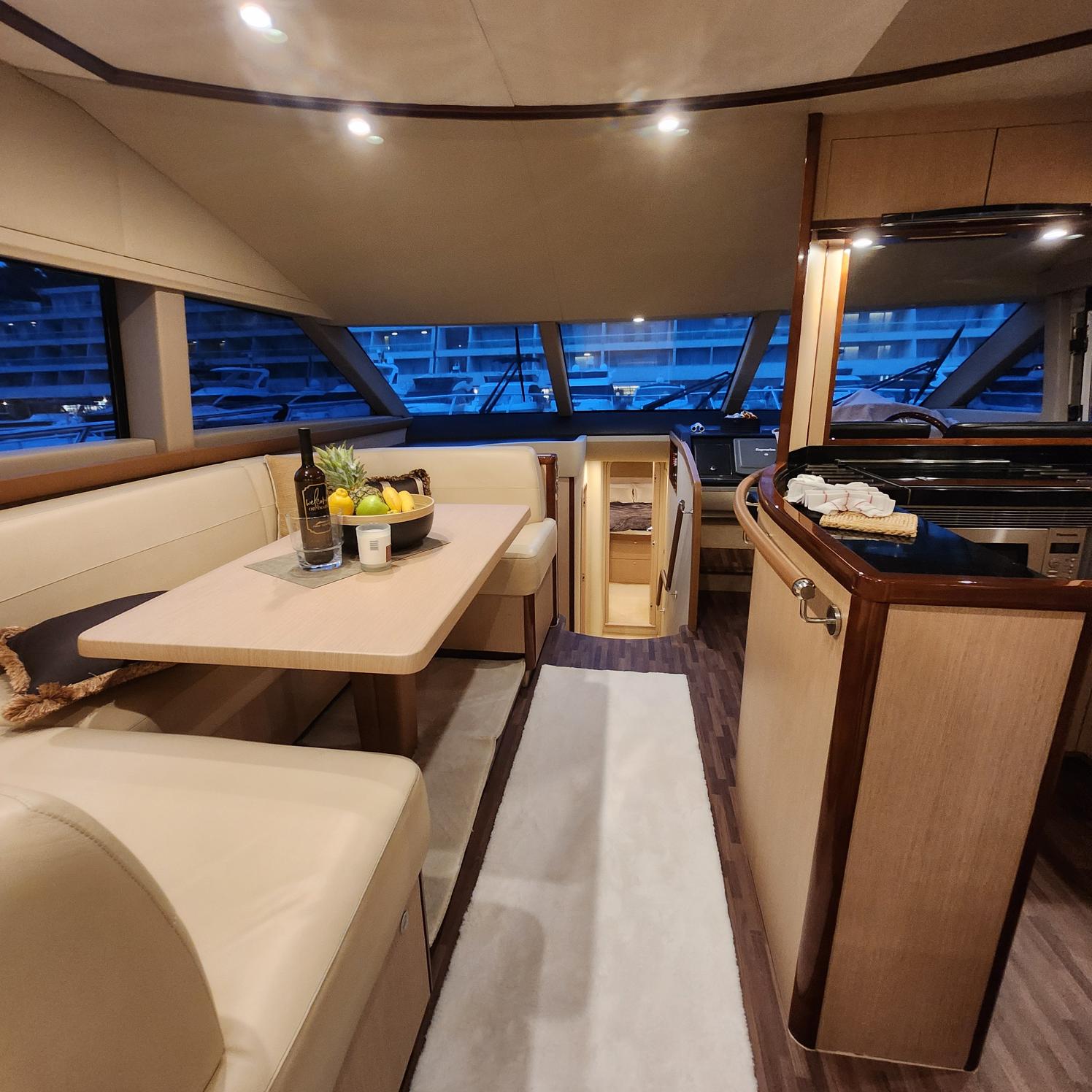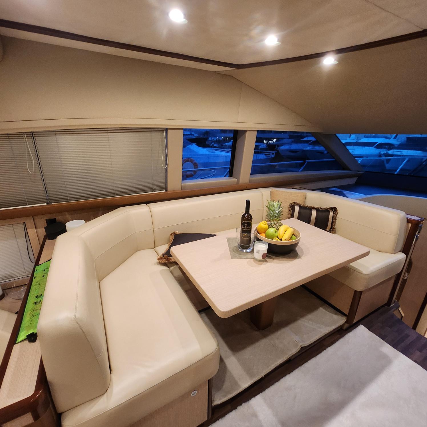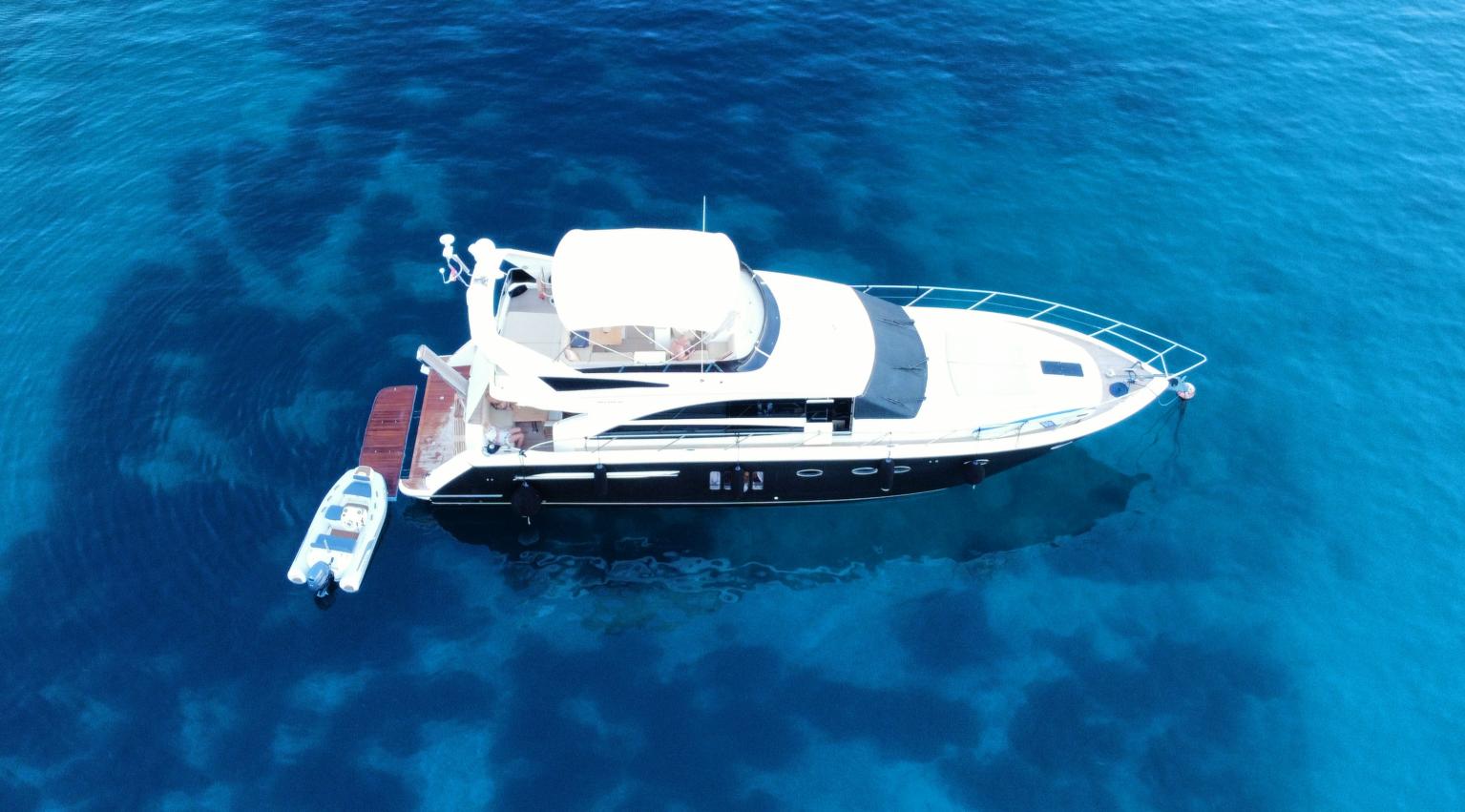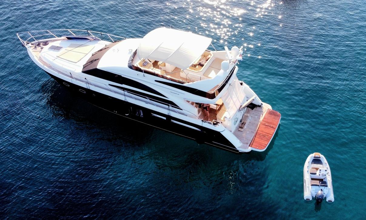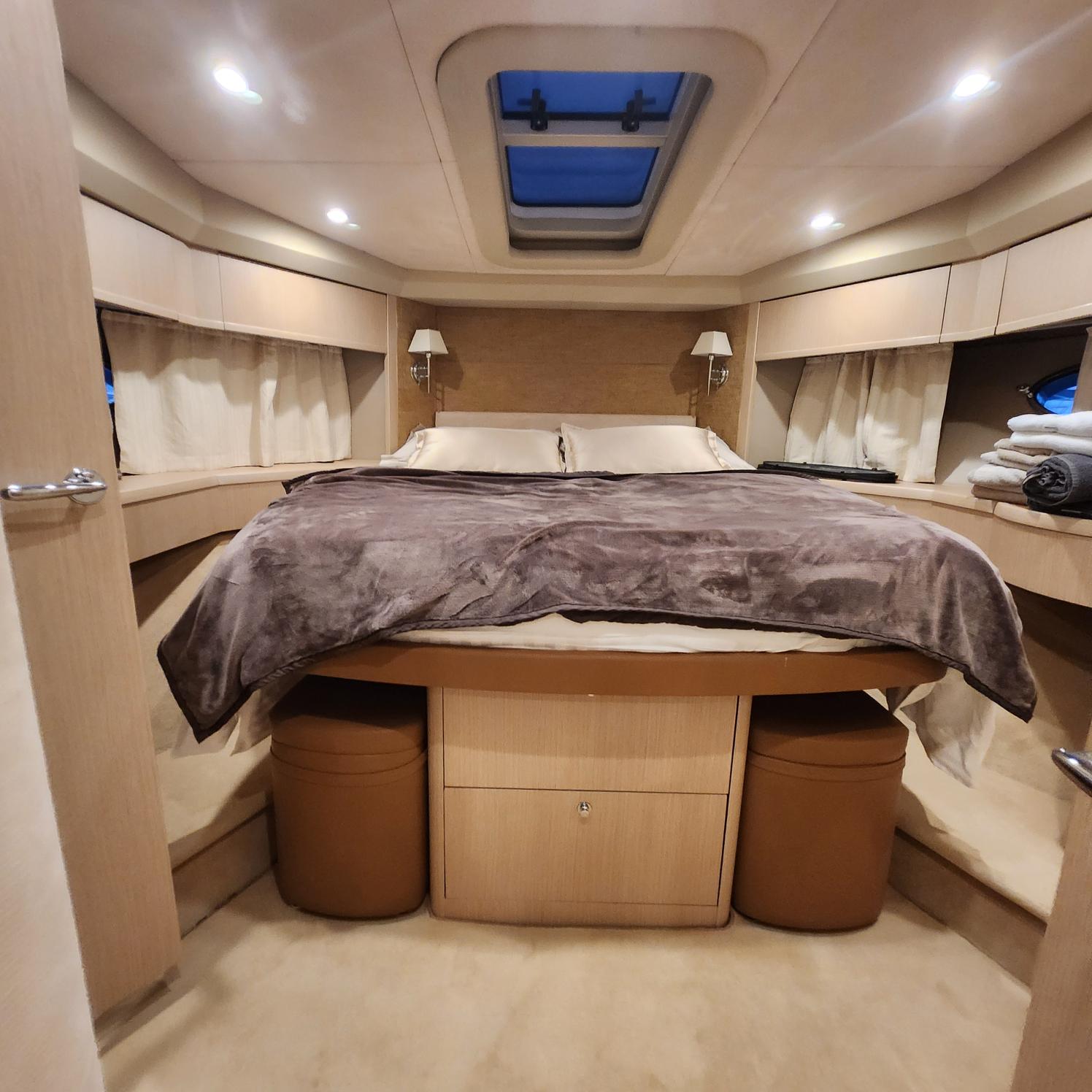 Princess 62 „Sassy“ was first launched in 2009 as a luxury stylish model of Princess Shipyard. Since then, this maritime gem has been an epitome of opulence and nautical skills. With a recent refit, Sassy not only maintains her regal allure but also embraces modernity in style and functionality. Moreover, Sassy’s allure is immediately evident as you step into her contemporary and neutral-toned interior. The spacious salon, with panoramic windows, invites abundant natural light, creating an open and airy ambiance. In addition, the aft lounge area boasts two generous sofas, a coffee table, and a state-of-the-art drop-down entertainment system. Forward, a spacious dining table, offers not only a meal but a feast for the eyes through the surrounding windows.