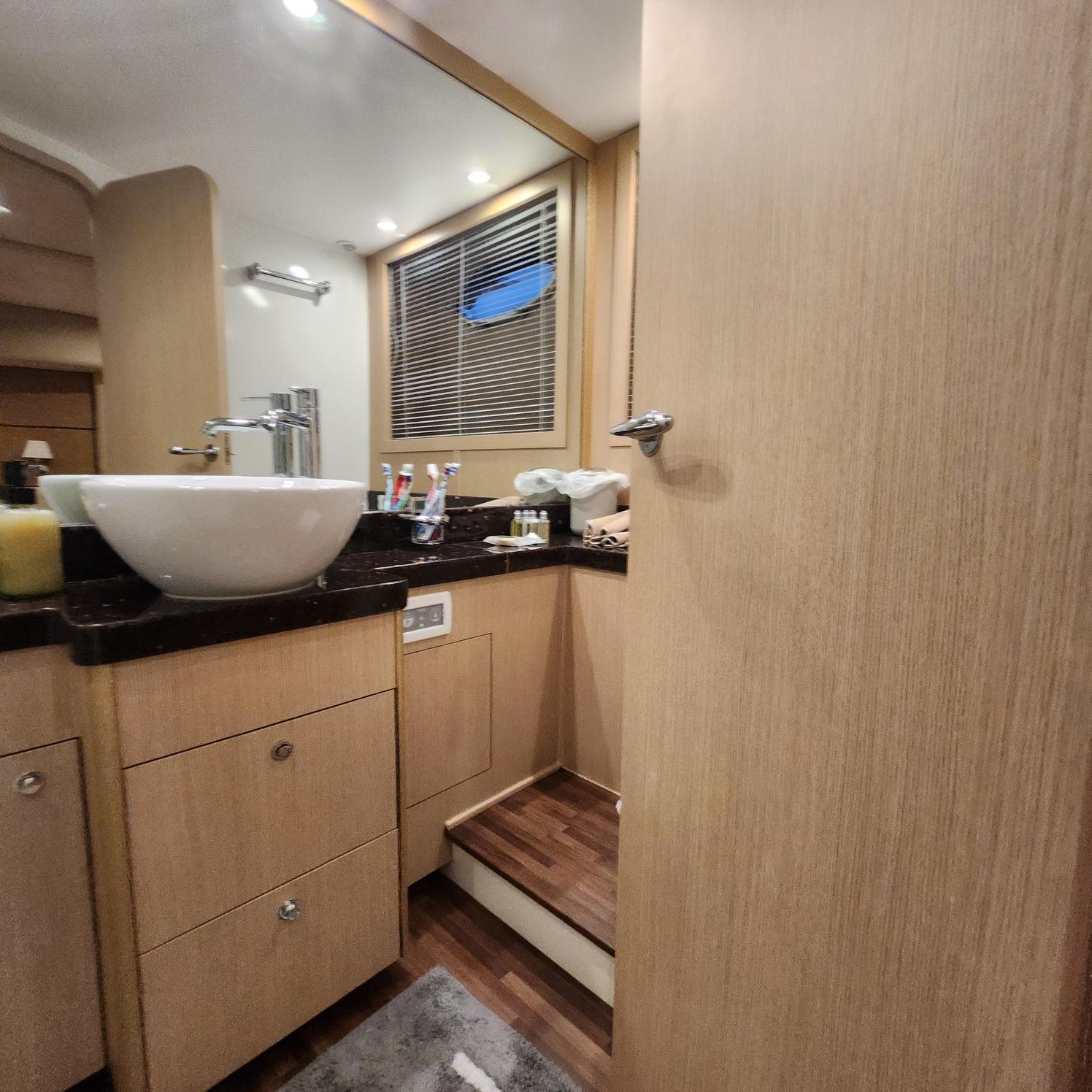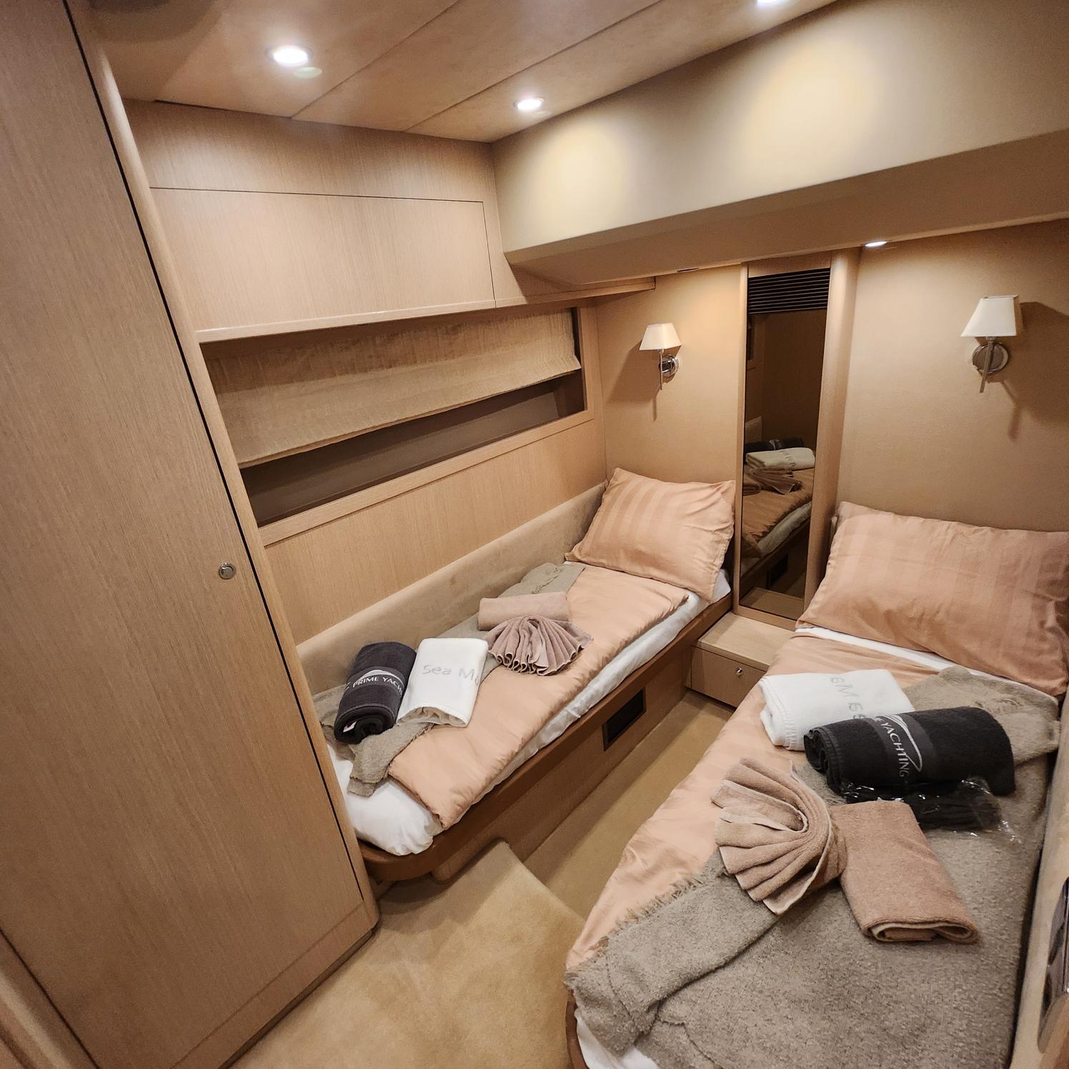 This luxury motor yacht offers spacious accommodation for up to 8 charter guests in 4 guest cabins. The master suite is a sanctuary of luxury with a queen-size bed, large vertical hull windows, TV entertainment, vanity, and a sofa. The VIP cabin, forward and full beam, features a center-lined double bed. Furthermore, two additional guest cabins complete the accommodations. One with side-by-side twin beds and the other with upper and lower single beds ensure a comfortable and personalized experience for all aboard.